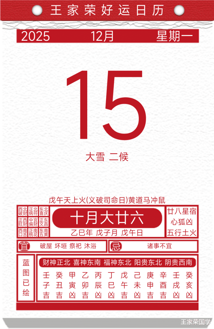 每日黄历吉凶宜忌2025年12月15日 星次:星纪 彭祖百忌:戊不受田,午不苫盖 十二值神:(破,司命,黄道吉日) 廿八星宿:心月狐 今日三合:狗,虎 今日六合:羊 今日五行:天干戊属土,地支属火,纳音属火 日柱纳音:天上火 吉神方位:喜神东南,财神正北,福神东北,阳贵东北,阴贵西南 今日胎神:房床碓外正东 今日吉星:六仪,守日,天官,解神,续世 今日凶星:月破,灾煞,厌对,招摇,披麻,天狱,天火,血忌,五虚,荒芜,义日 宜忌等第:下:凶又逢凶,遇德从忌不从宜,不遇诸事皆忌。 今日事宜:诸事不宜 今日事忌:诸事不宜 神煞宜忌:((六仪,守日,天官,解神,续世,月破,灾煞,厌对,招摇,披麻,天狱,天火,血忌,五虚,荒芜,义日),(诸事不宜,诸事不宜)) 本文严格按照协纪辨方书择日详解而编撰。 |