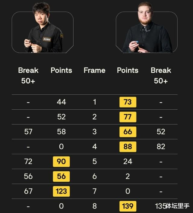 本站西安大奖赛,雷佩凡在资格赛对阵路易·希斯科特,一上来雷佩凡就是失误不断,路易·希斯科特凭借多次上手以73-44、77-52连胜两局取得2-0的领先。第三局,雷佩凡虽然打出了单杆57分,不过却被路易·希斯科特单杆52分以66-58逆转。第四局,路易·希斯科特直接轰出单杆82分,干净利落再胜,取得4-0的遥遥领先,在这场9局5胜制比赛中拿满了赛点。