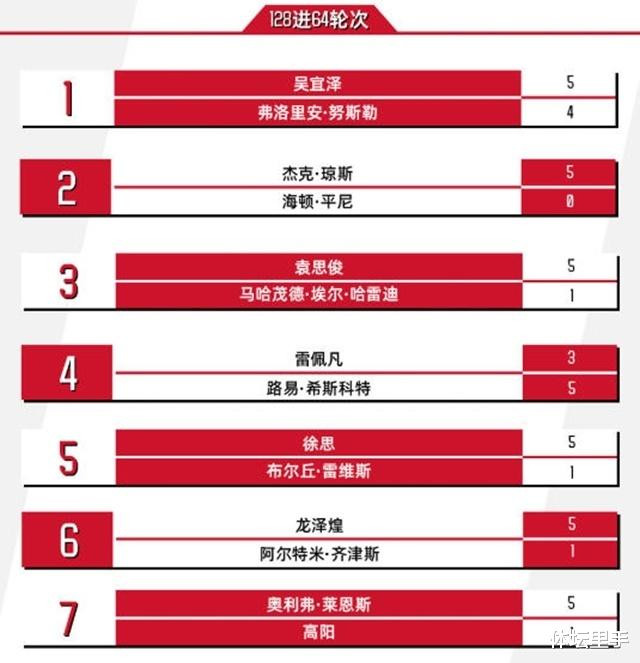 同时段进行的其余场次:吴宜泽打出一杆破百三杆50+以5-4绝杀弗洛里安·努斯勒,袁思俊5-1马哈茂德·埃尔·哈雷迪,龙泽煌先输一局后连扳五局5-1阿尔特米·齐津斯,徐思同样也是从0-1到5-1逆转布尔丘·雷维斯,高阳1-5输给了奥利弗·莱恩斯,杰克·琼斯5-0横扫海顿·平尼。 |