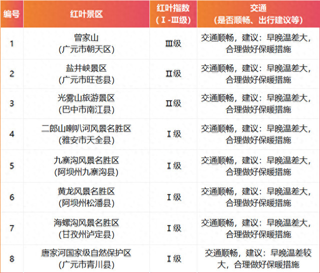 | 随着气温的下降 四川又红黄橙黄了! 今日 四川省林业和草原局发布 2025年度四川第一期红叶观赏指数 广元曾家山的红叶 率先迎来最佳观赏期 巴中光雾山部分点位也已层林尽染 而九寨沟、黄龙等地 还要再等等 一起来看 ↓↓ 2025年度 四川第一期红叶观赏指数