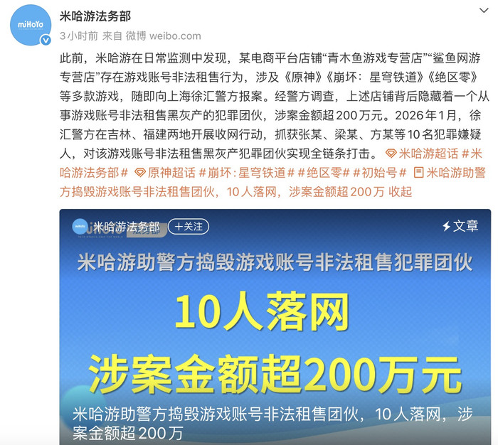 | 4月10日,据米哈游法务部官方微博号消息,公司联合上海市公安局徐汇分局,成功侦破一起特大游戏账号非法租售案,一个集“造号、养号、售号”于一体的专业化黑灰产团伙被彻底摧毁,共计10名犯罪嫌疑人落网,涉案金额超200万元。 该案系米哈游2026年打击游戏黑产的重大突破,也是国内针对账号非法交易全链条打击的典型案例。