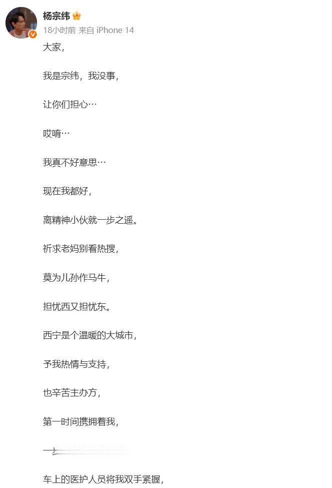 8月24日凌晨,杨宗纬在微博上发声,跟大家报平安。 他没卖惨也没煽情,字里行间反而都是温暖和感恩:“大家,我是宗纬,我没事,让你们担心⋯哎唷⋯我真不好意思⋯”