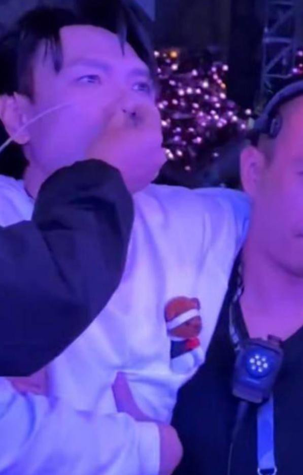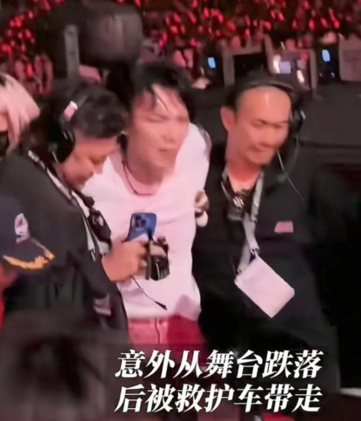 现场先是听到一声沉重的撞击声,麦克风也摔在了地上。歌声戛然而止,换成观众的惊叫声。 工作人员反应还算快,立马冲过去扶他,小心翼翼地把他挪走。现场的医护人员赶紧给他戴上了氧气面罩,可是就算吸着氧,他还是疼得死死咬着嘴唇,硬撑着。