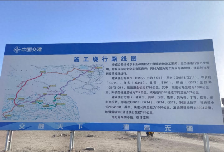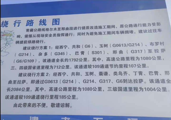 | 109国道提质改造工程目前正在进行之中,由于格尔木至那曲段全线都在改造,所以进出西藏的人可以选择其他线路出行,如果从成都方向那尽量选择走川藏线,如果从西宁方向,那么也有其他路线可以选择。