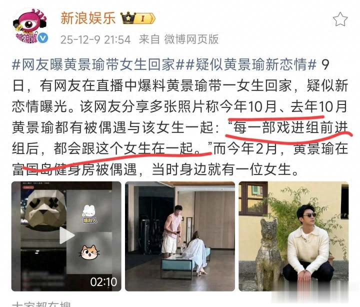 | 12月9日,有八卦博主爆料,男星黄景瑜疑似恋情曝光,该网友表示自己在去年十月份与今年的十月份分别偶遇黄景瑜都跟这个女孩子在一起,今年2月黄景瑜在健身时,身边也跟着一个女生,跟视频里面的女孩子很像。