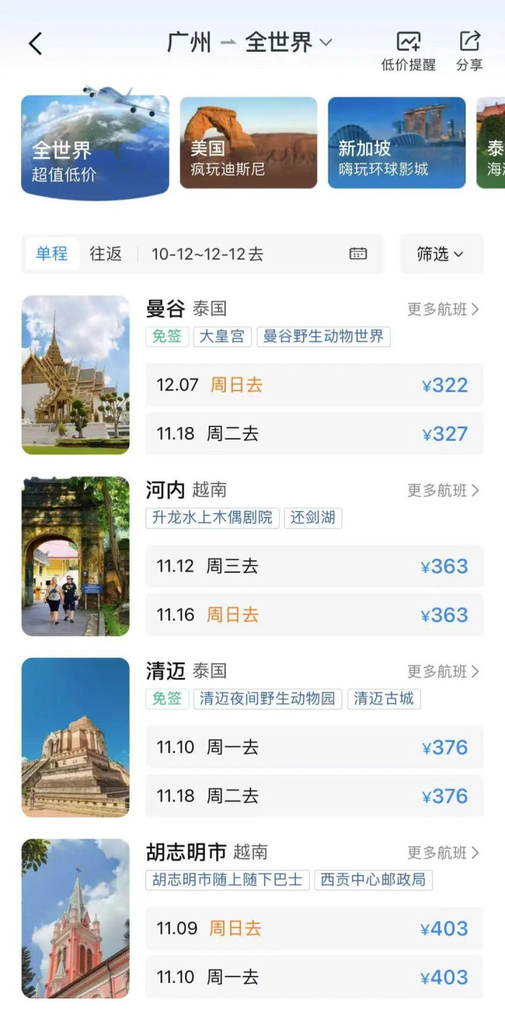 广州出境游机票价格也有下降 出境游方面 机票也出现了不同程度的降价 广州出发前往曼谷、河内、清迈 胡志明市等旅游地区的最低票价 都在400元上下