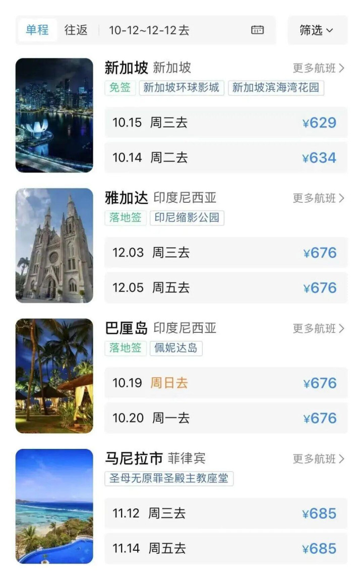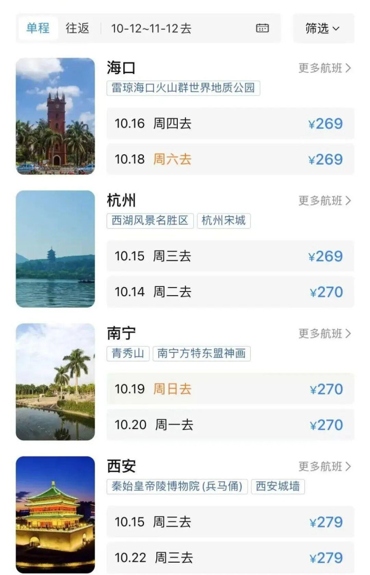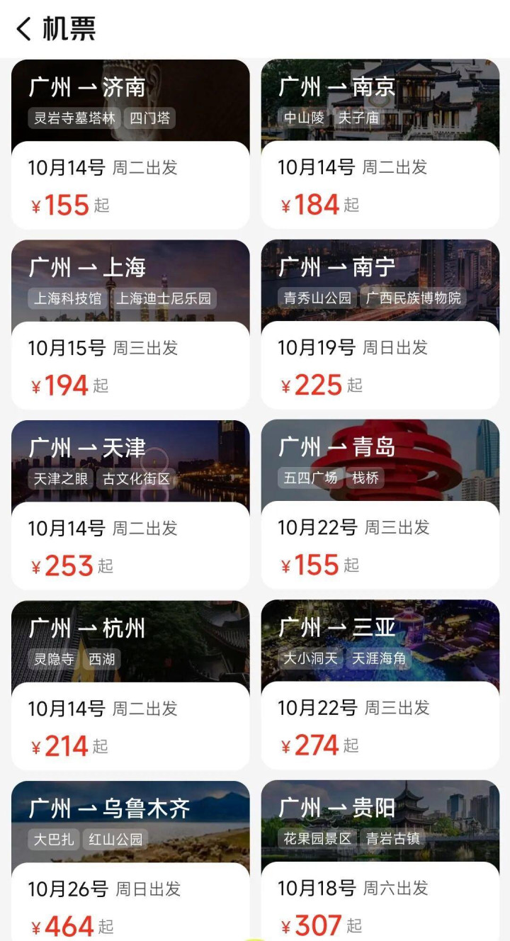 | 国庆中秋假期结束 2025年还剩80天 下一个假期就要到元旦啦 好消息是 节后机票价格“大跳水” 不少航线低至1-2折 适合“捡漏”错峰出游 年假还没用完的小伙伴 不妨安排一场说走就走的旅行吧 广州飞多地单程票价低至百元 小编查询多个平台发现 节后从广州出发 到济南、南京等热门城市 单程机票价格低至百元 (机票价格实时浮动 具体以平台实际价格为准)