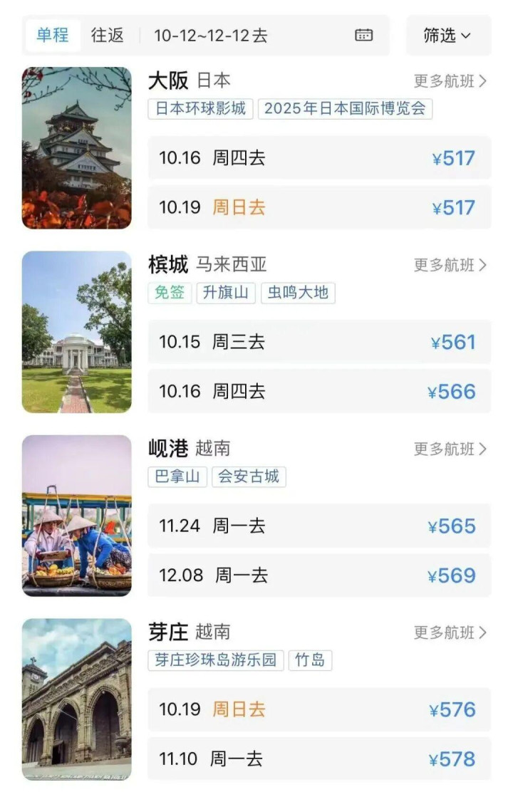 广州出发前往 大阪、槟城等地的最低票价 在500元左右