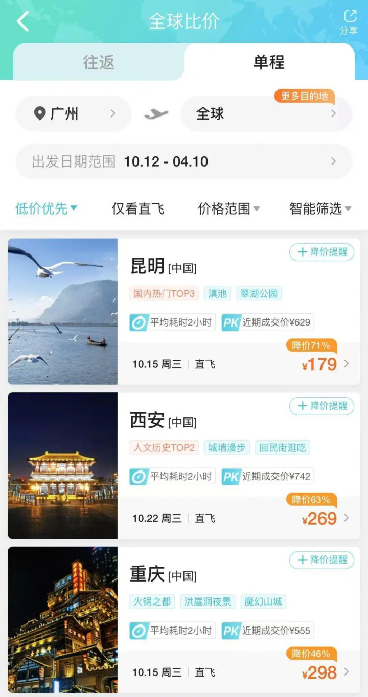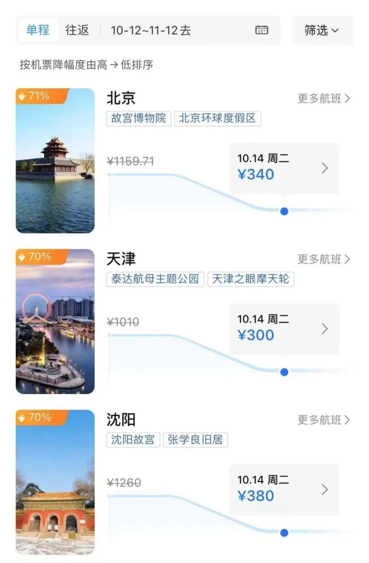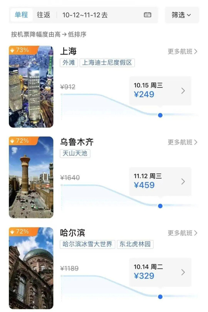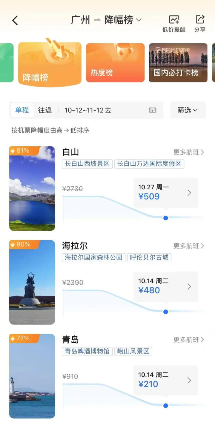 此外 广州飞上海、哈尔滨的机票价格 降幅也均达到了70%以上