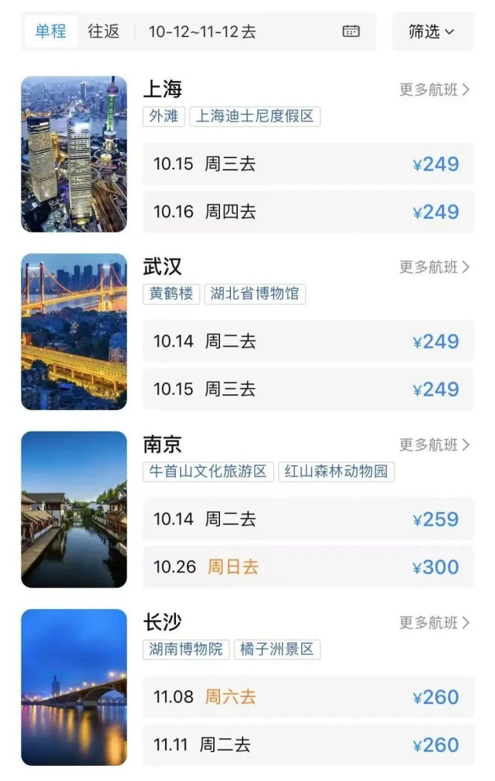前往上海、武汉、长沙等地 单程机票价格 最低两百余元