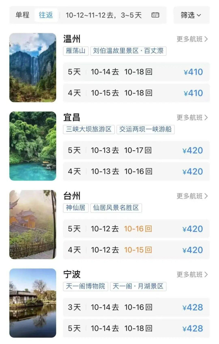 前往温州、宜昌等地 往返机票价格 仅需400元出头